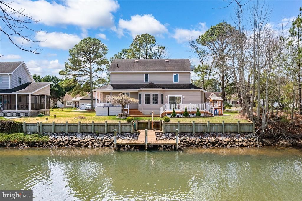 Nestled in Bayview Estates, just 6 miles from Fenwick Island, this meticulously maintained home offers a beautiful blend of waterfront lifestyle and cozy, community living. The heart of the home features an elegant dining area and large eat-in kitchen that flows that effortlessly into a large living room that overlooks the sparkling Canal water; here, a gas fireplace creates a warm ambiance, perfect for relaxing evenings. This residence offers four generously sized bedrooms with a luxurious master suite, complete with a walk-in closet and an en-suite bathroom on the second floor. Additionally there is a large office on the first floor that serves as a Fifth Bedroom option. Interior highlights include built-ins for added storage, a convenient laundry chute, and ceiling fans that enhance the home's comfort. Some recent Interior Improvements within the last 3 years include: New HVAC system, New Hot Water Heater, Fresh Paint, New Dryer, New Ceiling Fans, New Carpet and New Kitchen Flooring. The exterior of the property is equally impressive, featuring multiple outdoor spaces to enjoy the serenity of the canal and nature, including a wrap-around porch, expansive deck and patio, perfect for al fresco dining or simply soaking in the tranquil surroundings. Situated on a premium .25-acre lot in a peaceful cul-de-sac, this home offers a beautifully landscaped front and rear yard, ideal for outdoor activities, and with 76 feet of water frontage along the Assawoman Bay canal, you have direct access to navigable waters, perfect for boating, kayaking, or simply enjoying the picturesque views. The bulkhead is in excellent condition, with water run to the dock - and is ready to hold your summer boating dreams! An outside shower adds a touch of convenience after a day spent on the water. With more than sufficient storage, plus an attached two-car garage and ample driveway parking, convenience is at your fingertips. The community amenities include a clubhouse, outdoor pool, tennis courts, and a boat ramp, all for just a $375 Annual HOA Fee! Experience the ultimate in luxury living in this exceptional Bayview Estates home, where every detail has been thoughtfully curated to provide a sense of comfort and convenience. Embrace the waterfront lifestyle that awaits you in this remarkable property.